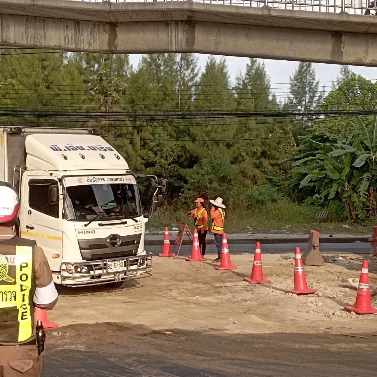 จากการตรวจสอบ พบว่าบริเวณดังกล่าวเป็นจุดที่กองการประปา เทศบาลนครสมุทรสาครได้ดำเนินการขุดเปิดผิวจราจร เพื่อดำเนินงานเชื่อมท่อส่งน้ำประปา ขนาดเส้นผ่านศูนย์กลาง 1,000 มิลลิเมตร และได้ทำการบดอัดคืนสภาพผิวจราจรแล้ว ต่อมาเกิดเหตุท่อประปาแตก ส่งผลให้เกิดการทรุดตัวของผิวจราจรบริเวณดังกล่าว