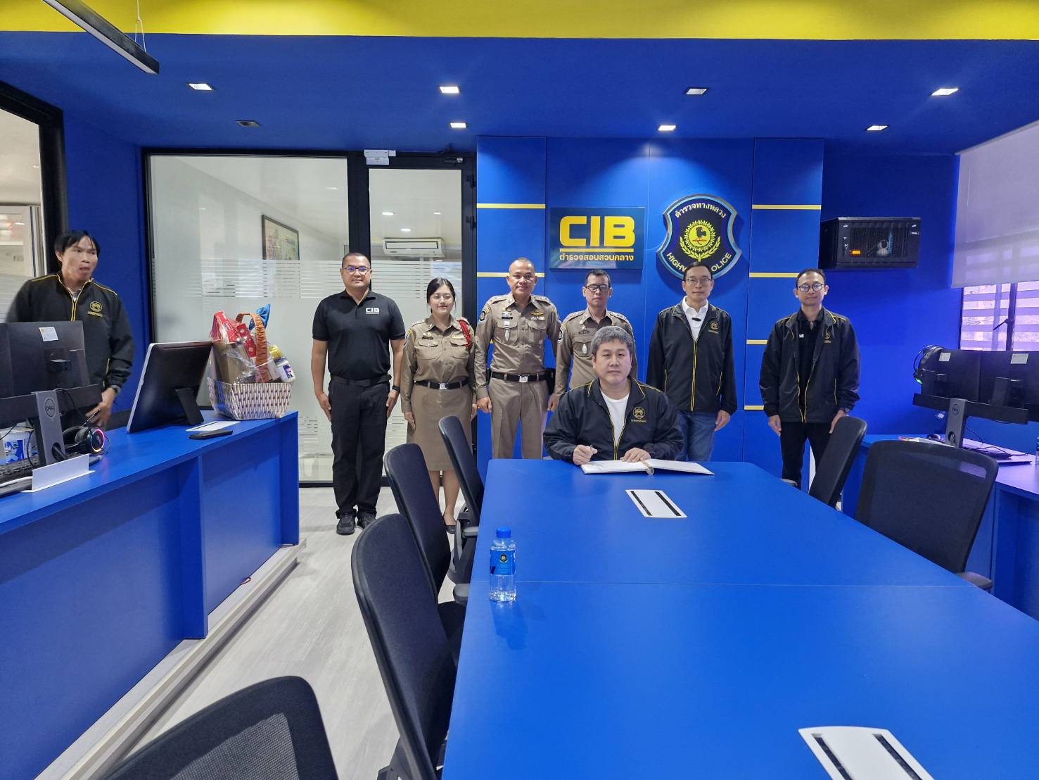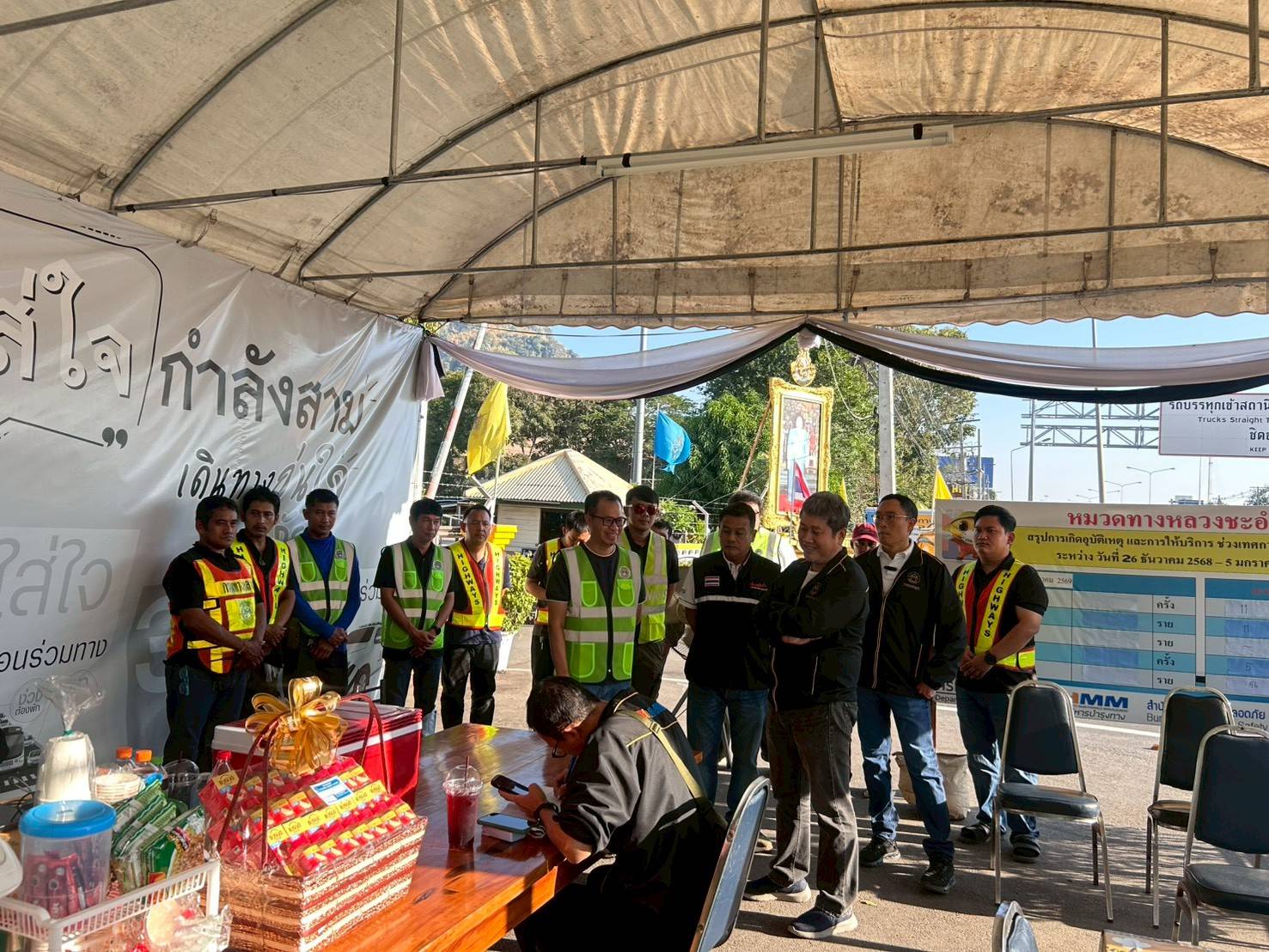 นายน้ำเพชร กิ่มสร้าง ผู้อำนวยการแขวงทางหลวงเพชรบุรี พร้อมข้าราชการและเจ้าหน้าที่ให้การต้อนรับ ณ จุดบริการหมวดทางหลวงชะอำ ทล.4 กม.185+700 Lt.