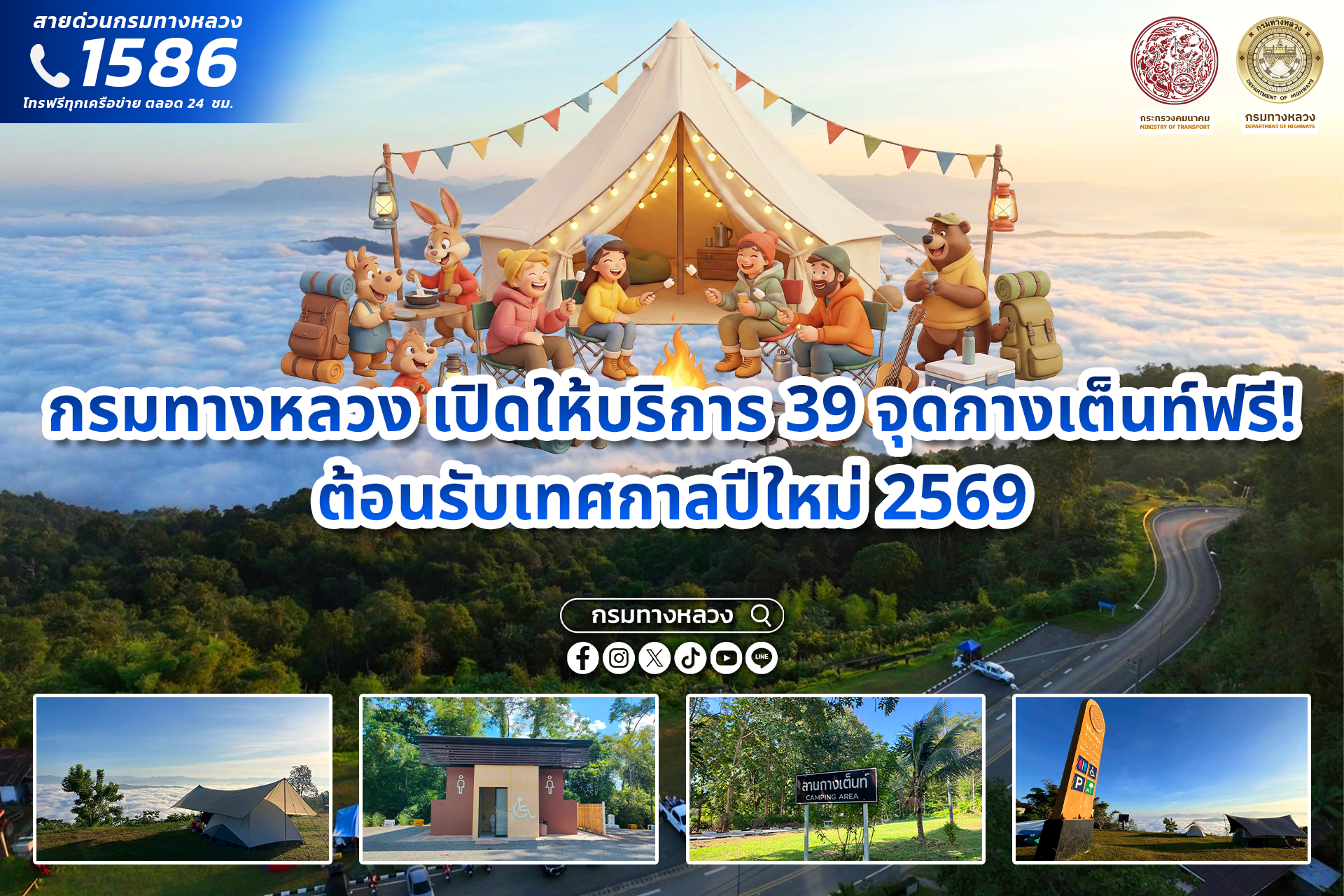 นายปิยพงษ์ จิวัฒนกุลไพศาล อธิบดีกรมทางหลวง เปิดเผยว่า กรมทางหลวงได้ขานรับนโยบายของกระทรวงคมนาคม “H.N.Y. 2569 – Happiness of All, Network of Care, and Year of Safety” ในการดำเนินงานเพื่อให้ประชาชนมีความสุขในทุกมิติ ทั้งด้านเศรษฐกิจ ความปลอดภัย การให้บริการที่เป็นมาตรฐานสากล รวมทั้งส่งเสริมศักยภาพทางเศรษฐกิจ การค้า การลงทุน การท่องเที่ยว และ ความมั่นคงของประเทศ โดยจัดเตรียมสถานที่ให้บริการจุดกางเต็นท์ทั่วประเทศ 39 แห่ง สำหรับประชาชนและนักท่องเที่ยวที่จะเดินทางไปพักผ่อน พักค้างคืน พร้อมลานจอดรถ โดยสามารถเข้าพักได้ตั้งแต่วันที่ 26 ธันวาคม 2568 – 5 มกราคม 2569 ซึ่งจุดกางเต็นท์ที่ได้จัดเตรียมไว้นั้น แบ่งเป็นภาคเหนือ 30 แห่ง ภาคตะวันออกเฉียงเหนือ 4 แห่ง ภาคกลาง 4 แห่ง และภาคใต้ 1 แห่ง โดยพื้นที่กางเต็นท์ จะตั้งอยู่ในพื้นที่ความรับผิดชอบของหมวดทางหลวง มีเจ้าหน้าที่คอยอำนวยความสะดวก และให้บริการประชาชนตลอด 24 ชั่วโมง พร้อมบริการ น้ำดื่ม ห้องสุขา โดยไม่มีค่าใช้จ่ายใด ๆ ทั้งสิ้น ดังต่อไปนี้