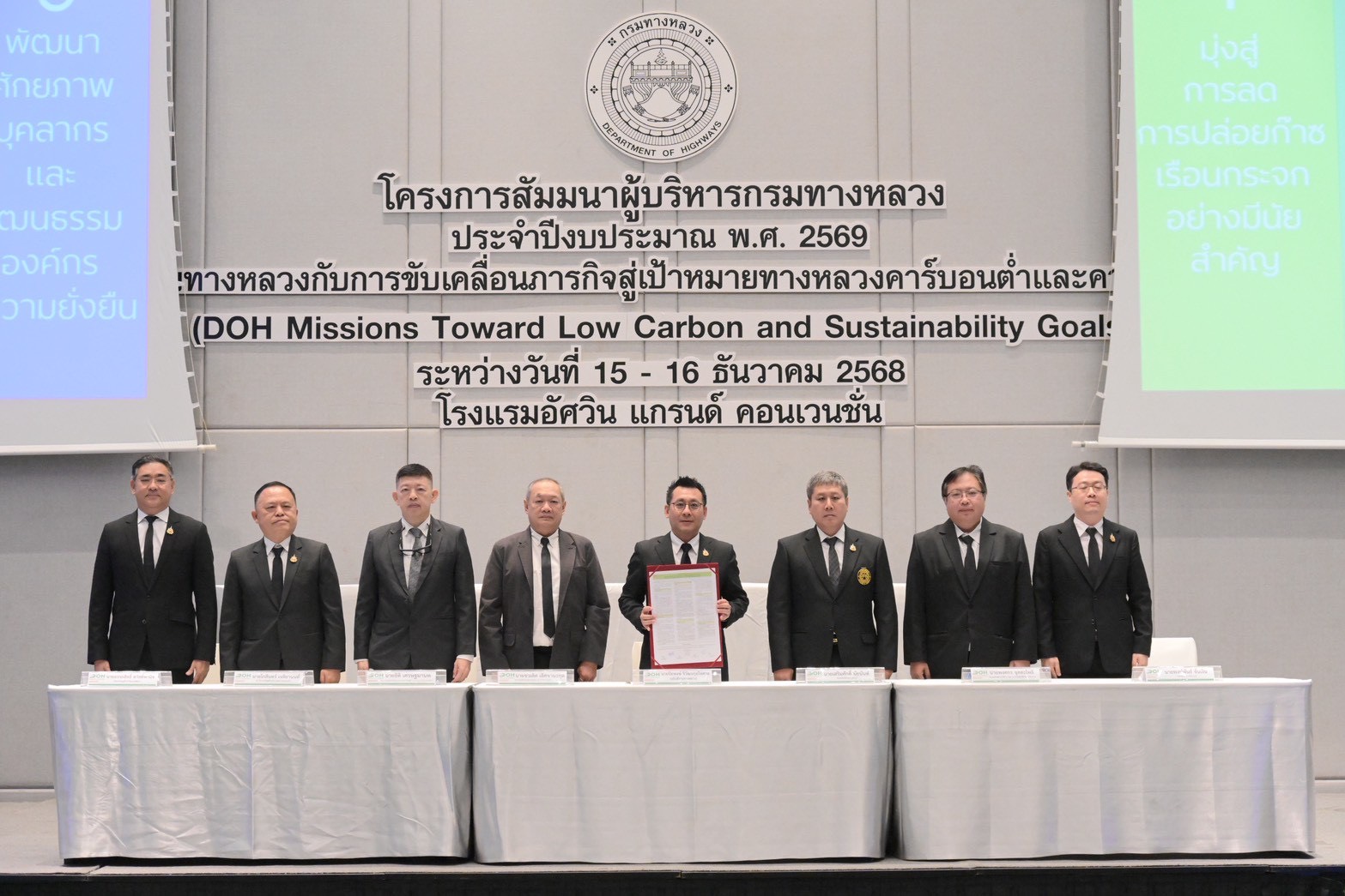 การสัมมนาครั้งนี้เป็นเวทีสำคัญ ที่กรมทางหลวงได้แสดงเจตนารมณ์ร่วมกันในการดำเนินงานด้านสิ่งแวดล้อมขององค์กรอย่างเป็นรูปธรรมโดยได้ลงนาม “ปฏิญญากรมทางหลวงมุ่งสู่ทางหลวงคาร์บอนต่ำและความยั่งยืนภายในปี ค.ศ. 2040” ซึ่งเป็นจุดเริ่มต้นของการร่วมกันขับเคลื่อนภารกิจทางหลวงในการลดคาร์บอนและการพัฒนาอย่างยั่งยืน เดินหน้าขับเคลื่อน 6 ประเด็นหลัก ได้แก่ การลดการปล่อยก๊าซเรือนกระจก การพัฒนาทางหลวงให้ยืดหยุ่นต่อสภาพภูมิอากาศ การนำเทคโนโลยีดิจิทัลและนวัตกรรมมาใช้ การบริหารจัดการทรัพยากรตามแนวคิดเศรษฐกิจหมุนเวียน การมีส่วนร่วมของประชาชนและภาคีเครือข่าย และการยกระดับศักยภาพบุคลากรด้านความยั่งยืน