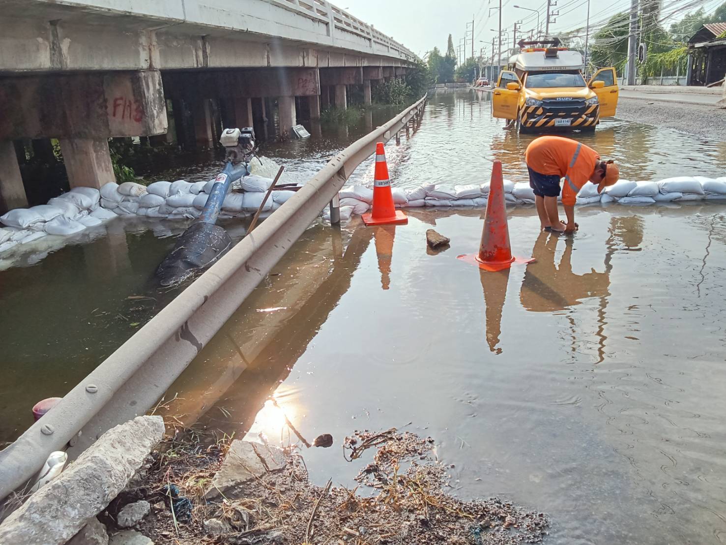 • วางกระสอบทรายทำเป็นคันบล็อคน้ำ อย่างหนาแน่นบริเวณท่อระบายน้ำในร่องแบ่ง เพื่อป้องกันไม่ให้น้ำทะเลที่หนุนสูงไหลทะลักเข้าสู่ช่องทางหลัก
