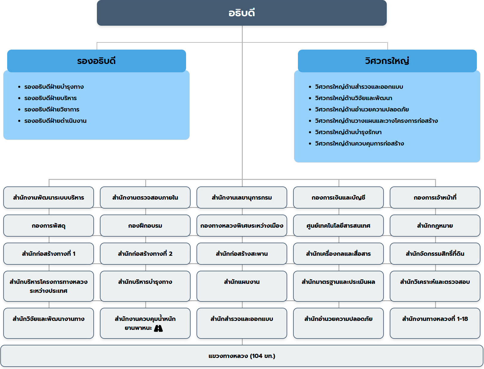 วิศวกรใหญ่ด้านวิจัยและพัฒนา วิศวกรใหญ่ด้านวางแผนและวางโครงการก่อสร้าง สำนักงานตรวจสอบภายใน วิศวกรใหญ่ด้านวิศวกรใหญ่ด้านบำรุงรักษา วิศวกรใหญ่ด้านสำรวจและออกแบบ รองอธิบดีฝ่ายบริหาร วิศวกรใหญ่ด้านอำนวยความปลอดภัย วิศวกรใหญ่ด้านควบคุมการก่อสร้าง สำนักเครื่องกลและสื่อสาร กองการเจ้าหน้าที่ อธิบดีกรมทางหลวง รองอธิบดีฝ่ายวิชาการ รองอธิบดีฝ่ายดำเนินงาน รองอธิบดีฝ่ายบำรุงทาง กองฝึกอบรม สำนักกฎหมาย สำนักบริหารบำรุงทาง สำนักแผนงาน สำนักวิเคราะห์และตรวจสอบ สำนักวิจัยและพัฒนางานทาง สำนักงานควบคุมน้ำหนัก ยานพาหนะ สำนักสำรวจและออกแบบ สำนักอำนวยความปลอดภัย สำนักงานทางหลวงที่ 1-18 แขวงทางหลวง (104 ขท.) สำนักก่อสร้างสะพาน สำนักงานเลขานุการกรม กองการเงินและบัญชี กองทางหลวงพิเศษระหว่างเมือง ศูนย์เทคโนโลยีสารสนเทศ สำนักก่อสร้างทางที่ 2 สำนักบริหารโครงการทางหลวงระหว่างประเทศ สำนักจัดกรรมสิทธิ์ที่ดิน กองการพัสดุ สำนักก่อสร้างทางที่ 1 สำนักมาตรฐานและประเมินผล สำนักงานพัฒนาระบบบริหาร aaa